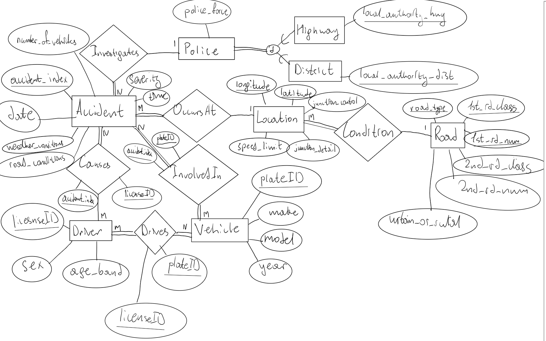 This project is done in a team of 3 people, where we begin by selecting a dataset and making entity relation diagrams around it, modifying the dataset slightly as we see fit so that it meets the required complexity and has learning value. For our project, we picked a dataset from Kaggle based around vehicle accidents in the UK: https://www.kaggle.com/datasets/tsiaras/uk-road-safety-accidents-and-vehicles
